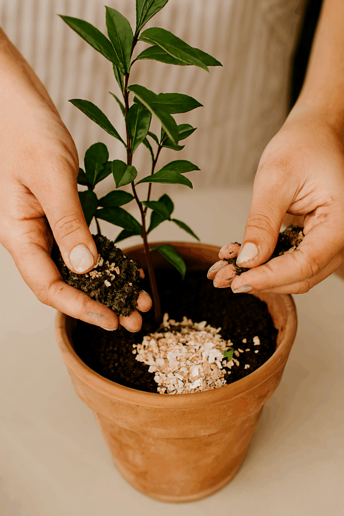 E sempre aplique o adubo longe do caule e misture na terra para evitar queimaduras.
